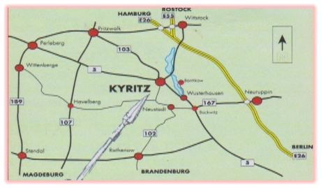 Wo finden Sie Kyritz?Zwischen Hamburg und Berlin!Kyritz erreichen Sie von Berlin bequem mit dem Zug, oder mit dem Auto über die A24 Berlin - Hamburg / Rostock. Abfahrt Neuruppin - Herzsprung. Möglich ist auch eine Anreise über die B5. Kyritz - Berlin 95 kmKyritz - Potsdam 85 kmKyritz - Hamburg