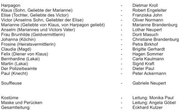 Es könnte so schön sein! Klaus ist in Marianne verliebt und sie in ihn.Seine Schwester Elise in Viktor - und der liebt sie ebenfalls.Wo also liegt das Problem?Im Finanziellen! Denn unglücklicherweise sind Klaus und Elise die Kinder von Harpagon, der vor allem eines ist: geizig!Und da passen die bettelarmen Zukünftigen nicht ins Konzept.Also durchkreuzt er die Heiratspläne seiner Kinder. Schlimmer noch,er findet urplötzlich auch noch Gefallen an Marianne. Doch als die Geldkassette gestohlen wird eskaliert die Situation. Beraubt vom schönstenwas es auf der Welt besitzt - seinem Geld - sinnt Harpagon auf Rache.Ein Schuldiger muss her ...