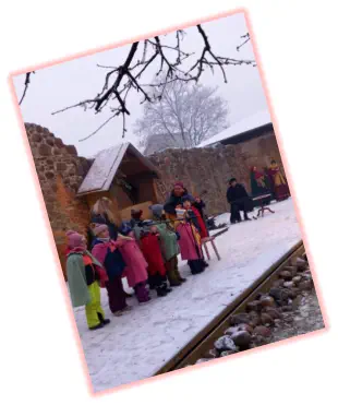 Weihnachtsgeschenke können gebastelt oder gekauft werden. Die Weihnachtslieder werden an Feuern von den