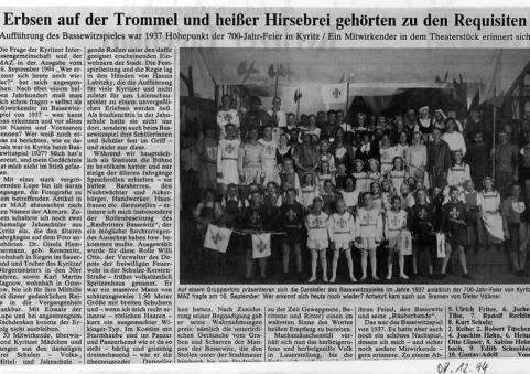Viele Jahrhunderte beließ man es bei der Kyritzer Bassewitztradition mit dem Dankgottesdienst und dem Austeilen von Rundstücken am Montag nach Invocavit. Ansonsten blieb außer einem Maskenball nicht viel übrig. Zu einem Festspiel reichte es nur 1937 zur 700 Jahrfeier der Stadt. Das Heimatspiel „Bassewitz vor Kyritz stand“ von dem Kyritzer Lehrer Walter Siegmann wurde auf der Saalbühne im „Deutschen Haus“ aufgeführt. An eine alljährliche Aufführung dachte damals niemand…Das Bassewitzspiel „Bassewitz vor Kyritz stand“ hatte 33 Mitwirkende, überwiegend Kyritzer Mädchen und Jungen, die hauptsächlich Komparsen Status hatten. Die älteren Jahrgänge hatten die Sprechrollen und stellten die Ratsherren, Ackerbürger, Handwerker, Hausfrauen usw. da. Die Festspielleitung lag in den Händen von Hanna Labitzky diese war Studienrätin in der Jahnschule und hatte den Ruf sich rigoros durchsetzen zu können.Die Rolle des furchterregenden Raubritters Bassewitz übernahm Willi Otte, der als Verwalter des Depots der freiwilligen Feuerwehr angestellt war. Er war ein 1,90 Meter großer Mann mit breiten Schultern, der seine Rolle sehr überzeugend spielte.